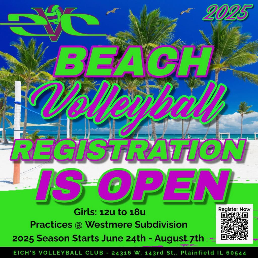 Practice will be held at Wesmere Subdivision Sand Courts (off of Caton Farm Road in Plainfield). The sand courts are right behind the Wesmere Country Club House and parking is available in the side lot of Wesmere Elementary School. Warm-up and conditioning will be for the first 30 minutes of practice. Drills are done for 1 hour and games are played for the last 30 minutes of each practice.